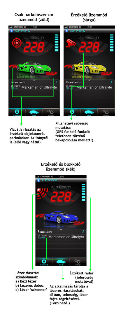 Az okostelefonunkra ingyenesen letölthető alkalmazás (IOS és Android) rögtön alkalmassá teszi azt bluetooth modulunk jelének fogadására. Így kapunk egy nagyon szép, letisztult grafikus kijelzőt AL Priority készülékünkhöz, mely vizuálisan és audio (beszéd) is tájékoztat riasztáskor, legyen az sebességmérő lézerre történő riasztás, vagy a parkolószenzor funkció riasztása közelgő objektumra. Mindezt a telefonunkon keresztül.